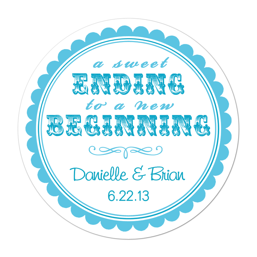 Sweet Ending To A New Beginning Scallop Border Personalized Wedding Favor Sticker